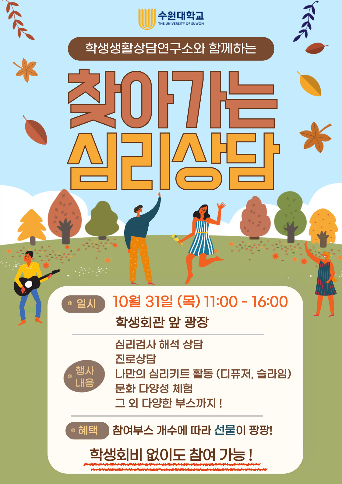 안녕하세요. 학생생활상담연구소입니다 : ) 수원대 학우들의 참여율이 높았던 ‘찾아가는 심리상담’ 행사가 10월 31일(목) 11시부터 16시까지 진행될 예정입니다! 다양한 체험활동과 선물로 인해 학생들에게 즐거움은 물론이고 심리상담 및 정신건강에 대한 올바른 정보도 제공받을 수 있는 행사랍니다. 이번 학기에는 아래의부스들이 운영될 예정이에요. ∨ 상담전문가 선생님들과 함께 하는 ‘간이 심리검사 해석상담’ ∨ 마음돌봄 서포터즈들이 준비한 ‘내 마음챙김 슬라임’과 ‘긍정바이브 디퓨저’ ∨ 또래상담 학생들이 준비한 ‘감정 맞추기 스피드 퀴즈’ ∨ 대학일자리플러스센터에서 진행하는 ‘찾아가는 진로상담’ ∨ ‘화성시아르딤복지관이 학생들에게 알려주는 ’AAC 쉽게알기‘ ∨ 경기지역암센터, 화성시서부보건소에서 ‘오늘부터 걱정말암!’ ∨문화더함공간 서로에서는 ‘문화다양성 베트남 체험부스’ 정말 많은 부스들이 준비되어있죠? 참여하는 부스가 많아질수록 드리는 선물도 많아지니 큰 가방 들고 놀러오세요 : ) 행사시간: 10.31(목) 11:00 ~ 16:00 장소: 수원대학교 학생회관 앞 광장 문의: 031-220-2415 coun@suwon.ac.kr 학생생활상담연구소 -운영시간: 9시 ~ 17시 30분 - 점심시간 12시 30분 ~ 13시 30분 - 당신을 위한 전문상담기관 학생생활상담연구소 - |