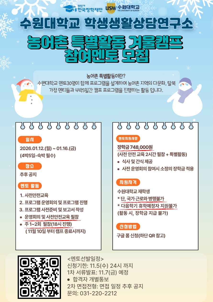 <다문화 탈북학생 멘토링 장학금 멘토 모집> 안녕하세요! 학생생활상담연구소입니다. 한국장학재단에서 다문화 탈북학생 멘토링 장학사업 중 겨울캠프에 참여 멘토를 모집하고 있습니다. 많은 참여 바랍니다. 일시 2026.01.12.(월) ~ 2026.01.16.(금) (4박5일 숙박 필수!) 장소 추후 공지 멘토 활동 1. 사전 안전교육 2. 프로그램 운영회의 및 프로그램 진행 3. 프로그램 사전준비 및 보고서 작성 - 운영회의 및 사전안전교육 필참 - 운영회의는 주 1~2회 진행 예정(18시~) (11월 10일부터 캠프 종료시 까지) 멘토지원사항 장학금 748,000원 +@ (사전 안전교육 2시간 + 특별활동) - 식사 및 간식 제공 지원자격 *수원대학교에 재학중인 학생 *4대 보험 미가입자 * 국가 근로와 병행불가 * 다음학기 휴학예정자 지원불가 (활동시, 장학금 지급 불가) 신청 링크 https://docs.google.com/forms/d/1WGxpMkSyxu1PoBhsdAfiOQCl34QfvmKCilJH0H6PntQ/edit |