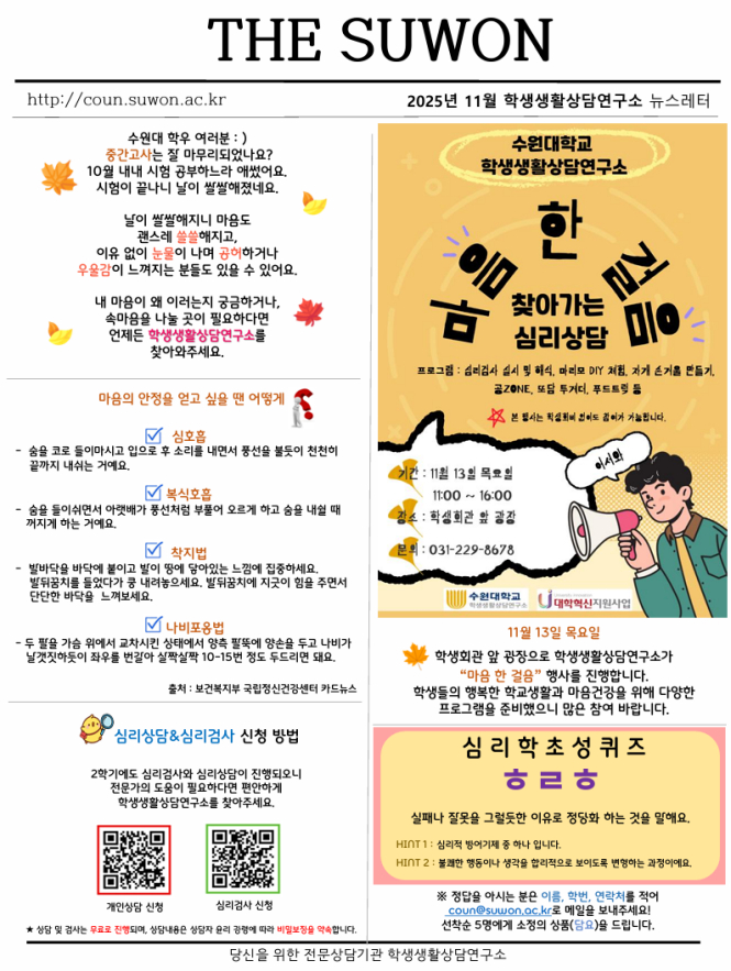 수원대 학우 여러분 : ) 중간고사는 잘 마무리 되었나요? 10월 내내 시험 공부하느라 애썼어요. 시험이 끝나니 날이 쌀쌀해졌네요. 날이 쌀쌀해지니 마음도 괜스레 쓸쓸해지고, 이유없이 눈문이 나며 공허하거나 우울감이 느껴지는 분들도 있을 수 있어요. 내 마음이 왜 이러는지 궁금하거나, 속마음을 나눌 곳이 필요하다면 언제든 학생생활상담연구소를 찾아와주세요. 1. 마음의 안정을 얻고 싶을 땐 어떻게? ☺ 심호흡 숨을 코로 들이마시고 입으로 후 소리를 내면서 풍선을 불 듯이 천천히 끝까지 내쉬는 거예요. ☺ 복식호흡 숨을 들이쉬면서 아랫배가 풍선처럼 부풀어 오르게 하고 숨을 내쉴 때 꺼지게 하는 거예요. ☺ 착지법 발바닥을 바닥에 붙이고 발이 땅에 닿아있는 느낌에 집중하세요. 발뒤꿈치를 들었다가 쿵 내려놓으세요. 발뒤꿈치에 지긋이 힘을 주면서 단단한 바닥을 느껴보세요. ☺ 나비포옹법 두 팔을 가슴 위에서 교차시킨 상태에서 양측 팔뚝에 양손을 두고 나비가 날갯짓하듯이 좌우를 번갈아 살짝살짝 10-15번 정도 두드리면 돼요. 출처: 보건복지부 국립정신건강센터 카드뉴스 2. 심리상담 & 심리검사 신청 방법 2학기에도 심리검사와 심리상담이 진행되오니 전문가의 도움이 필요하다면 편안하게 학생생활상담연구소를 찾아주세요. 상담 및 검사는 무료로 진행되며, 상담내용은 상담자 윤리 강령에 따라 비밀보장을 약속합니다. ♥ 개인상담 신청 : https://moaform.com/q/ZQrp6Z ♥ 심리검사 신청 : https://moaform.com/q/bAK84k 3. 수원대학교 학생생활상담연구소 “마음 한 걸음” 행사 진행 11월 13일 목요일 11:00~16:00 학생회관 앞 광장에서 학생생활상담연구소가 “마음 한 걸음” 행사를 진행합니다. 학생들의 행복한 학교 생활과 마음 건강을 위해 다양한 프로그램을 준비하였으니 많은 참여 바랍니다. 본 행사는 학생회비 없이도 참여가 가능하오니 많은 참여 부탁드립니다. ♥ 프로그램 : 심리검사 실시 및 해석, 마리모 DIY 체험, 자개 손거울 만들기, 공ZONE, 또담 투게더, 푸드트럭 등 4.. 심리학초성퀴즈 “ㅎㄹㅎ” 실패나 잘못을 그럴듯한 이유로 정당화 하는 것을 말해요. hint1) 심리적 방어기제 중 하나입니다. hint2) 불쾌한 행동이나 생각을 합리적으로 보이도록 변형하는 과정이에요. * 정답을 아시는 분은 이름, 학번, 연락처를 적어 coun@suwon.ac.kr로 메일을 보내주세요! 선착순 5명에게 소정의 상품(담요)을 드립니다. ※ 장애 학생의 경우 프로그램 진행시 최대한 불편하지 않게 배려해드리오니 사전에 연락을 주시기 바랍니다. 감사합니다. |
